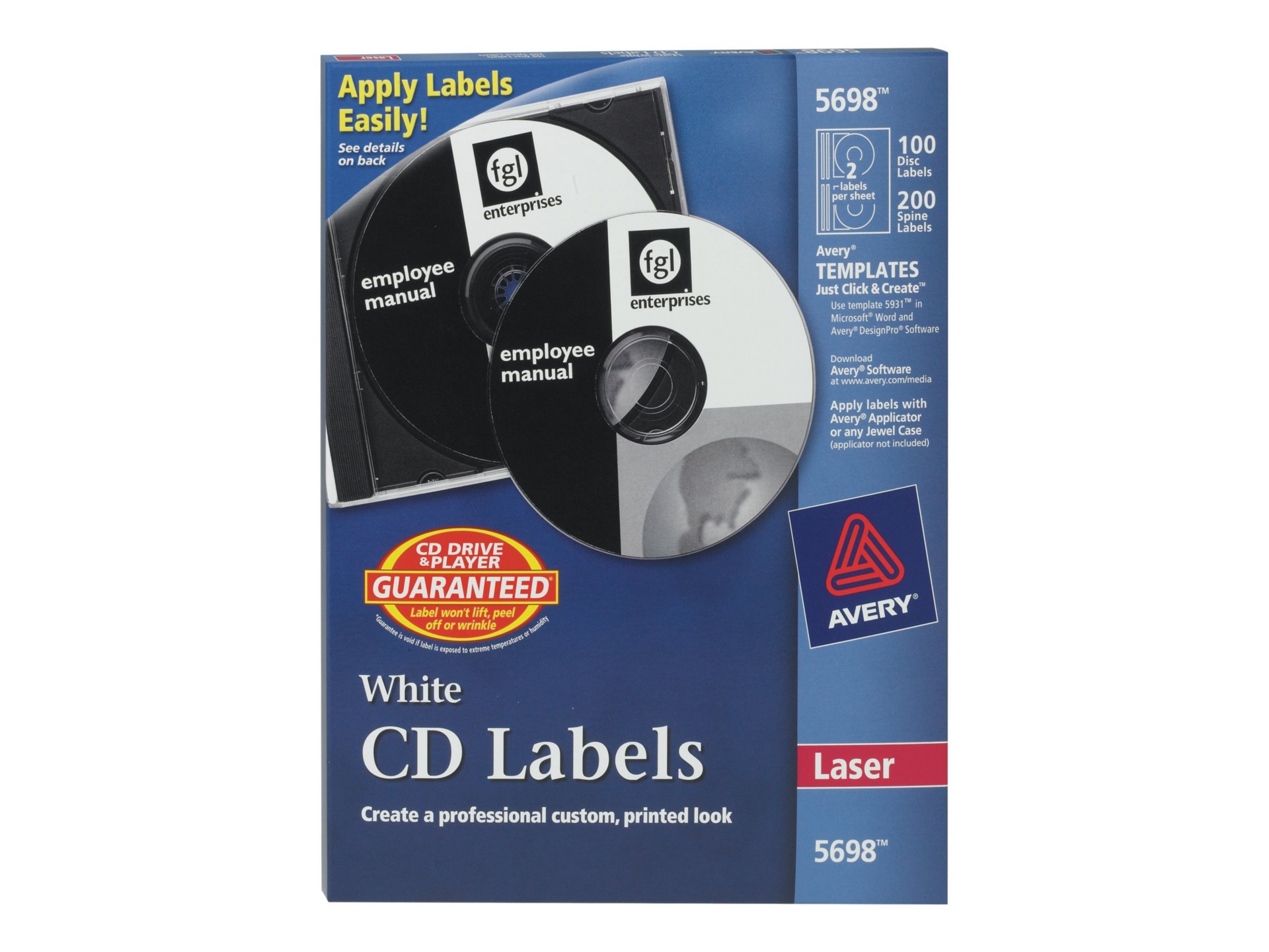 Avery® Matte Laser CD/DVD Labels, White, 250/Pack (AVE5697) Avery matte white laser CD/DVD paper labels come in packs of 250 for convenience. Avery matte white laser CD/DVD paper labels organize your digital records and vital documents on a digital disc format. Avery guarantees that these labels do not lift, peel off or wrinkle, which protects your optical drive machines from damage.