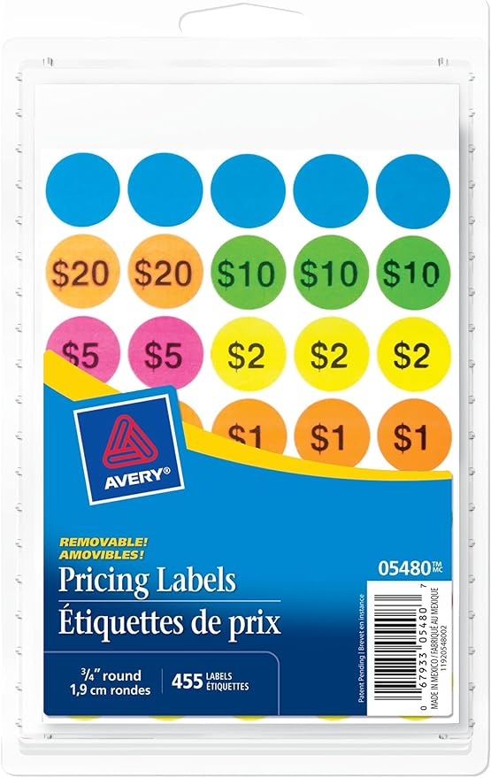 Avery Removable Pricing Labels, 3/4", Round,Assorted Colours - 2333 With these convenient pricing labels, your next garage sale will be easier than ever. Removable preprinted garage sale labels are round labels that feature preprinted popular prices ranging from 10 cents to $20, plus additional blank labels that allow you to add your own price. Identify garage sale items with bright labels in assorted colours