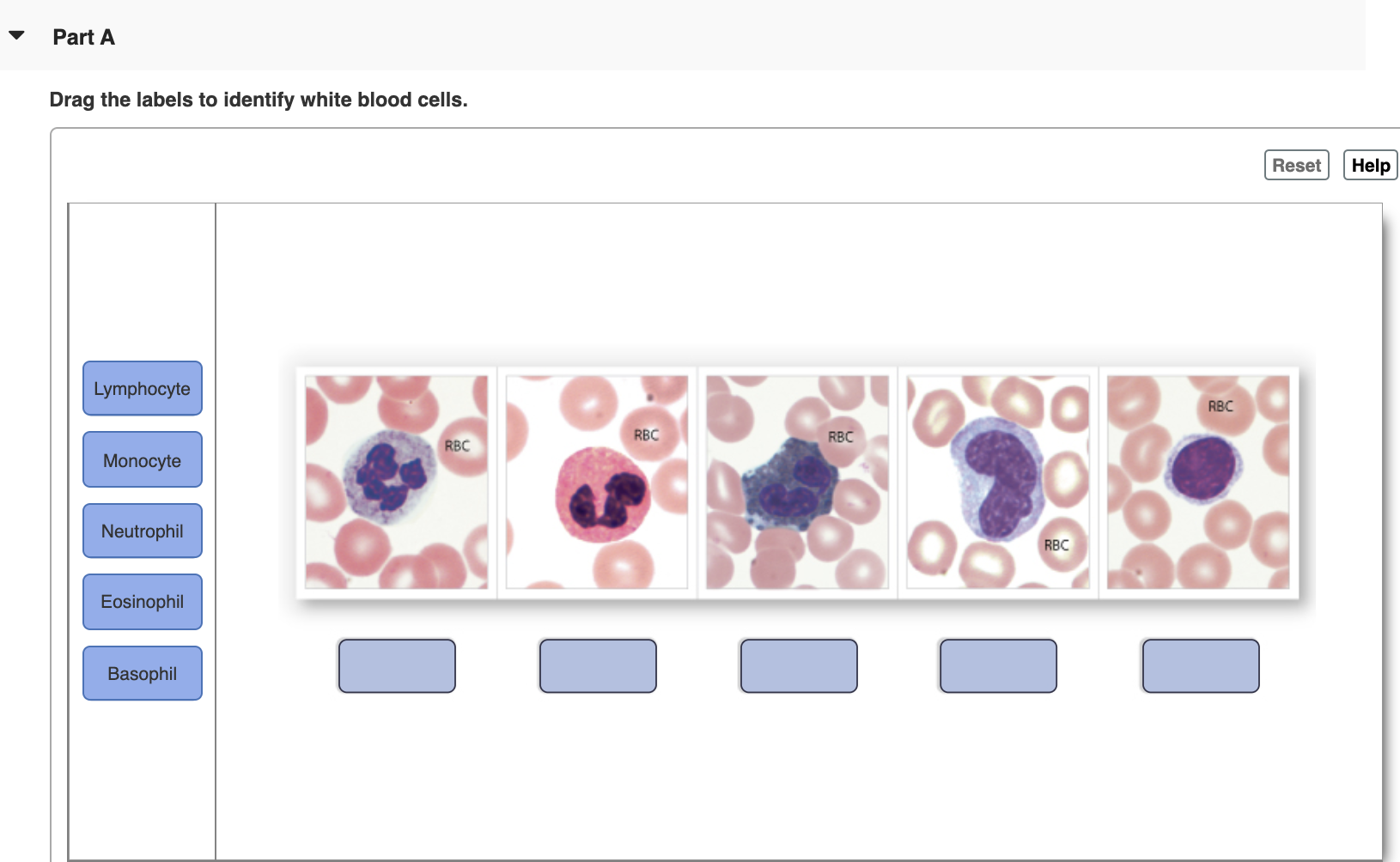 Solved Part A Drag the labels to identify white blood cells. | Chegg.com Anatomy and Physiology. Anatomy and Physiology questions and answers. Part A Drag the labels to identify white blood cells. Reset Help Lymphocyte RBC RBC RBC RBC Monocyte Neutrophil RBC Eosinophil Basophil. Question: Part A Drag the labels to identify white blood cells. Reset Help Lymphocyte RBC RBC RBC RBC Monocyte Neutrophil RBC Eosinophil ...